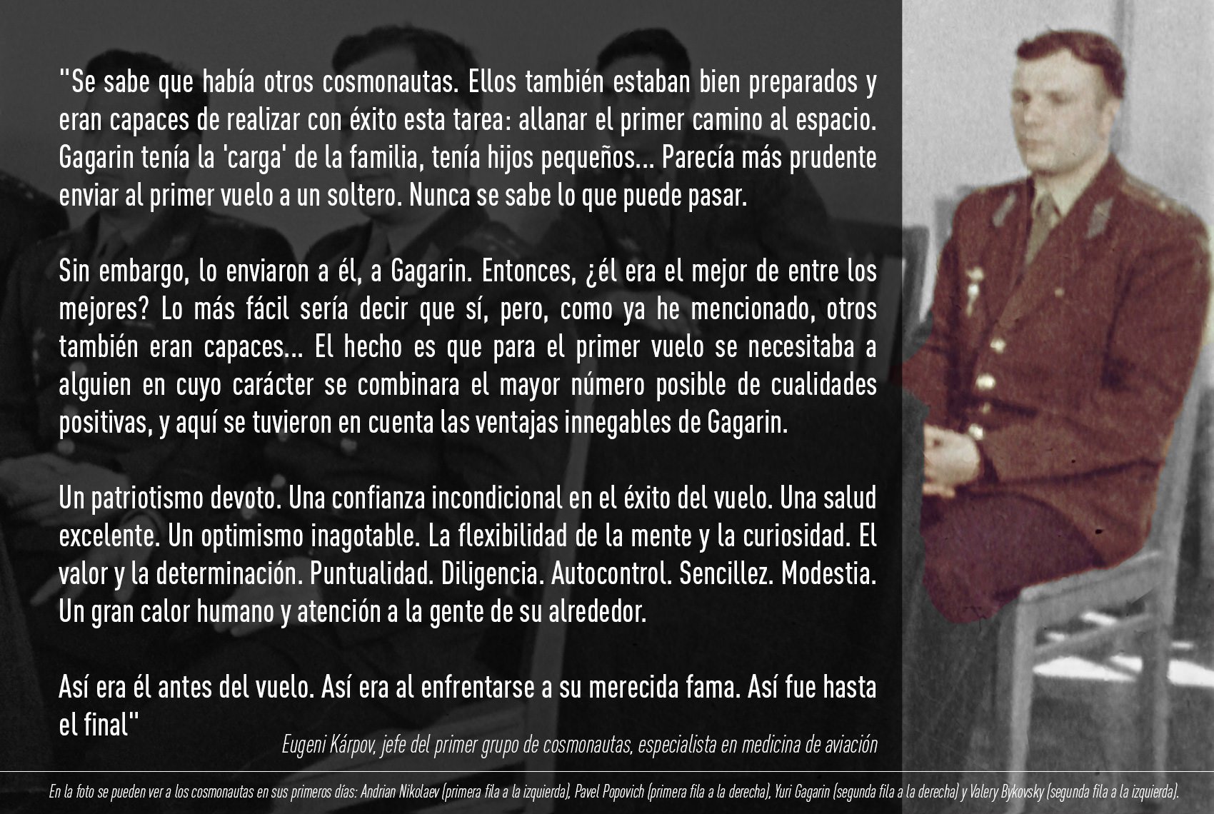 En principio nadie podía saber cuál de los 20 jóvenes pilotos seleccionados para la preparación del primer vuelo cósmico abriría para la humanidad el camino a las estrellas. A medida que se perfilaban los detalles de este vuelo, se formó un grupo de seis personas que empezaron el entrenamiento con un programa diferente. Uno de los compañeros de entrenamiento de Gagarin fue Guerman Titov, el segundo cosmonauta. Todo el grupo se preparaba para los futuros vuelos espaciales, pero había que elegir a un único piloto para el primer vuelo de la historia.