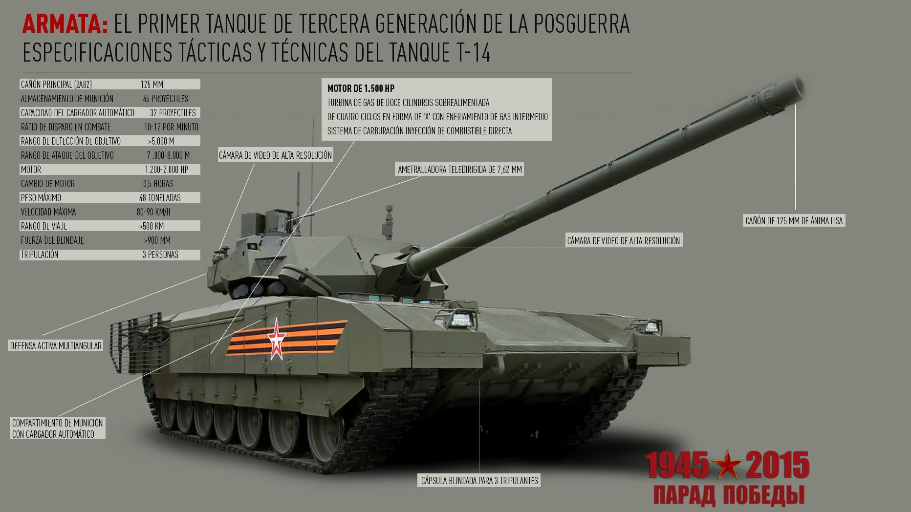 El tanque ruso T-14 Armata, con un diseño innovador y características sin análogos en el mundo, puede ser un serio adversario en la batalla, consideran los analistas de la revista estadounidense 'The National Interest', que han intentado pronosticar, sobre la base de publicaciones de los expertos militares Dave Majumdar y Sebestian Roblin, cómo sería una supuesta batalla entre el novedoso vehículo blindado ruso y los mejores tanques y misiles estadounidenses.