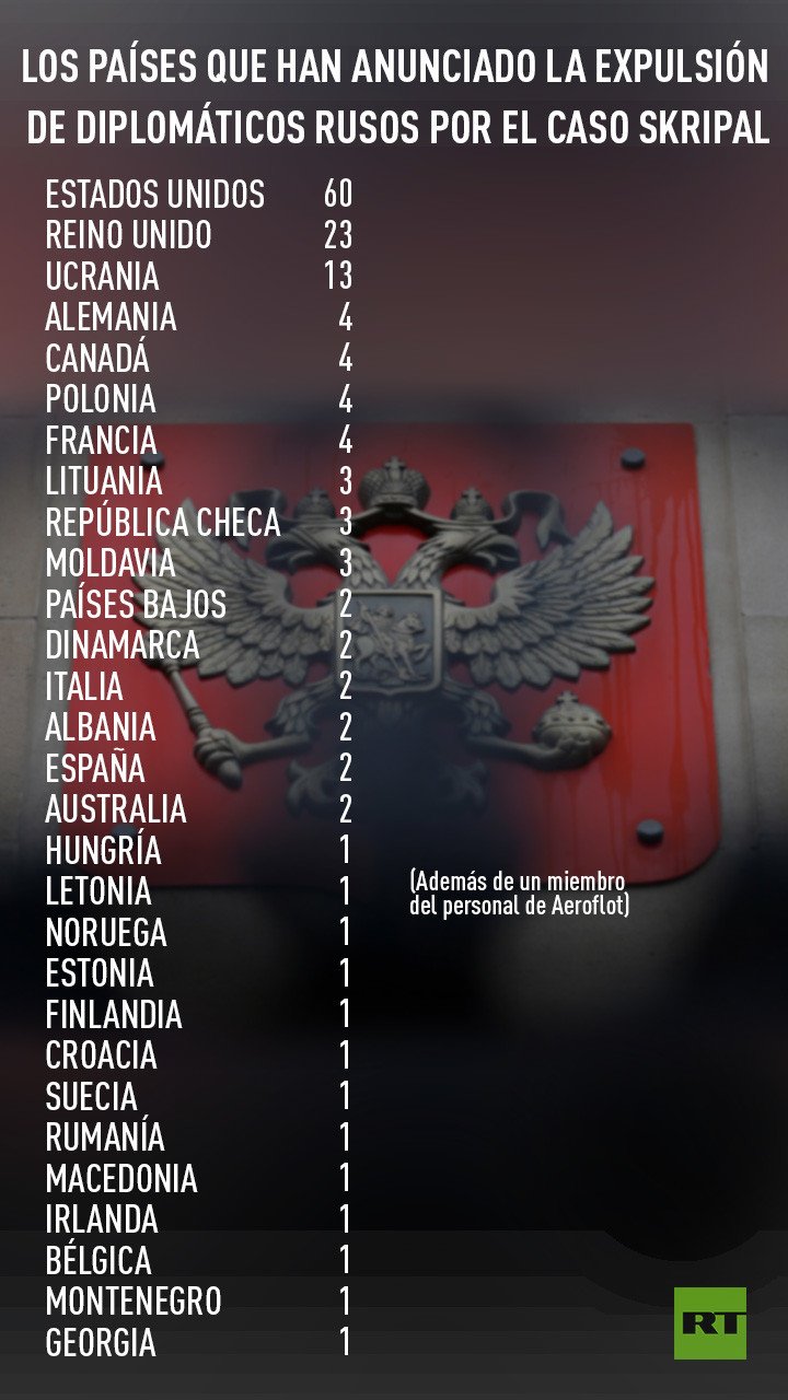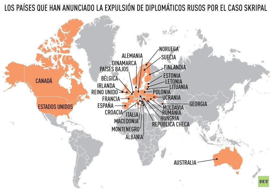 El escándalo alcanzó su auge este 26 de marzo, cuando EE.UU., 16 Estados miembros de la UE, así como Canadá, Ucrania, Noruega, Albania y Macedonia decidieron expulsar a diplomáticos rusos del territorio de sus respectivos países.