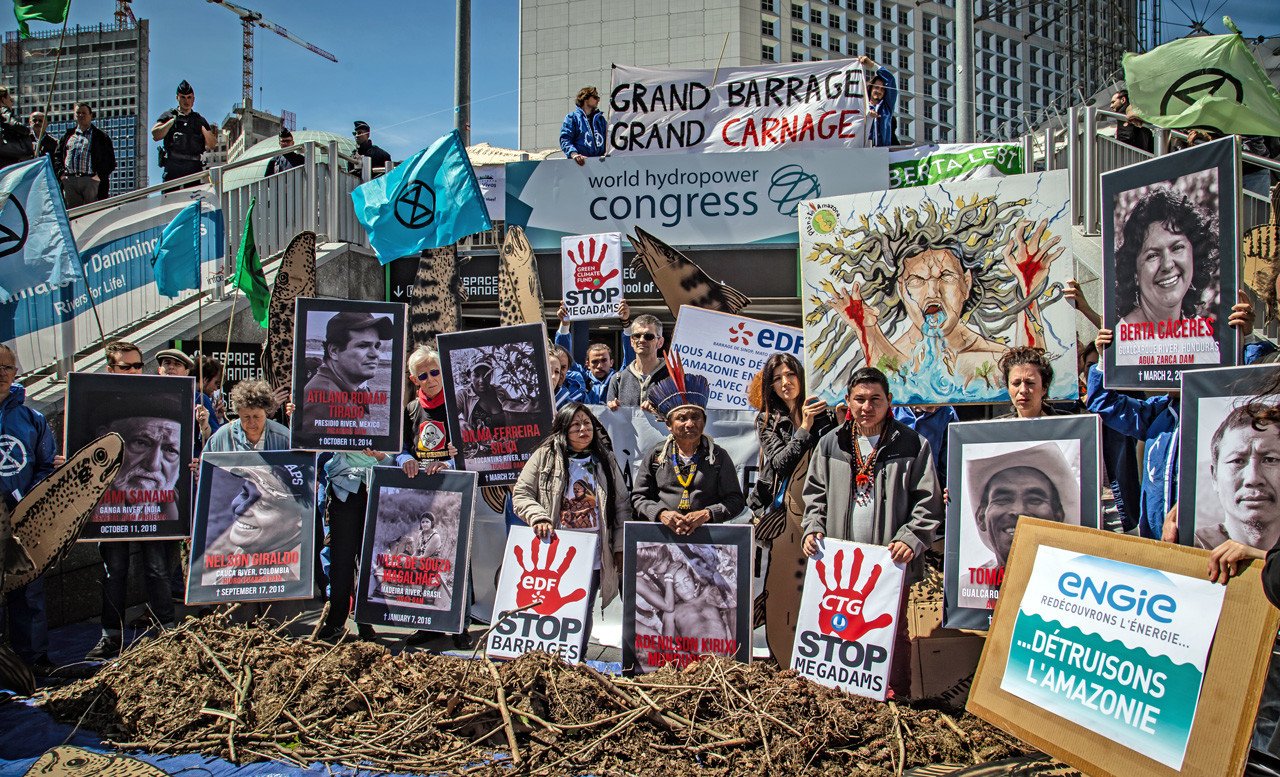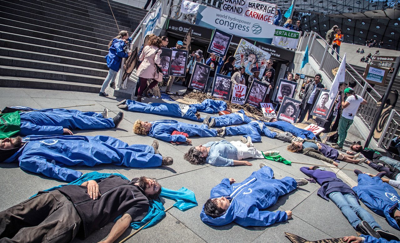 El barrio financiero de París, La Defense, recibió este 14 de mayo la inauguración del Congreso bianual mundial de la energía hidroeléctrica (World Hydropower Congress), organizado por la Asociación Internacional de la Hidroelectricidad (IHA, por sus siglas en inglés). Conforme avanzaba la primera jornada, la puerta de entrada del evento desaparecía entre las pancartas y la protesta de representantes de la sociedad civil contraria a este tipo de inversiones.