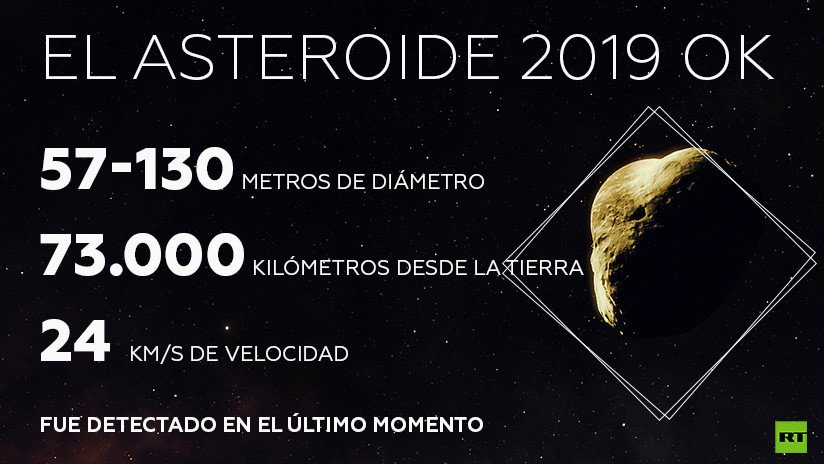 Este 25 de julio se ha descubierto un nuevo asteroide, bautizado como 2019 OK y con unas dimensiones semejantes a un campo de fútbol. Aproximadamente a las 1:22 GMT, el cuerpo celestre pasó inusualmente cerca de la Tierra a una velocidad de más de 24,5 kilómetros por segundo (88.500 kilómetros por hora), pero los científicos no se dieron cuenta de su presencia hasta pocas horas antes, afirma el portal ScienceAlert.