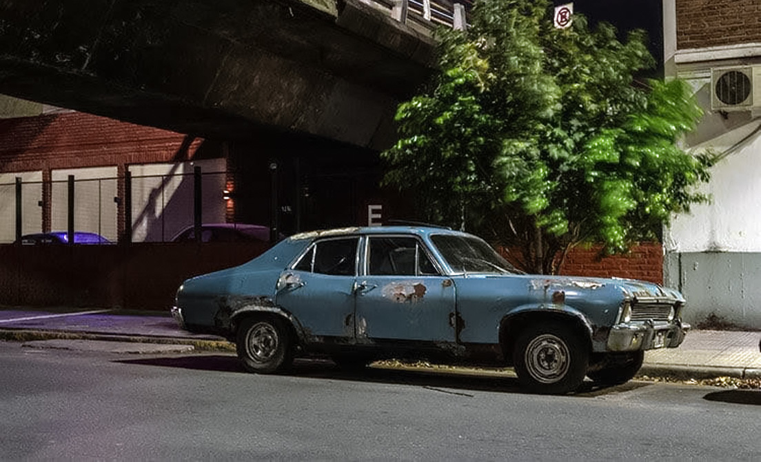 Un manojo de chapas azules, atigrado con manchas de herrumbre y ruedas con láminas de polvo, como si la embestida del tiempo lo hubiera encallado en el pavimento a la espera de que alguien lo descubra. Desde la vereda de enfrente, Gerardo Korn, de 59 años, fotógrafo, realizador audiovisual, calibra la mirada. El automóvil, un Chevrolet Chevy de los años '70, se guarece entre una autopista y la sombra recortada de un árbol en el barrio de Boedo, Buenos Aires. Gerardo desenfunda. Estira el trípode, coloca la cámara.