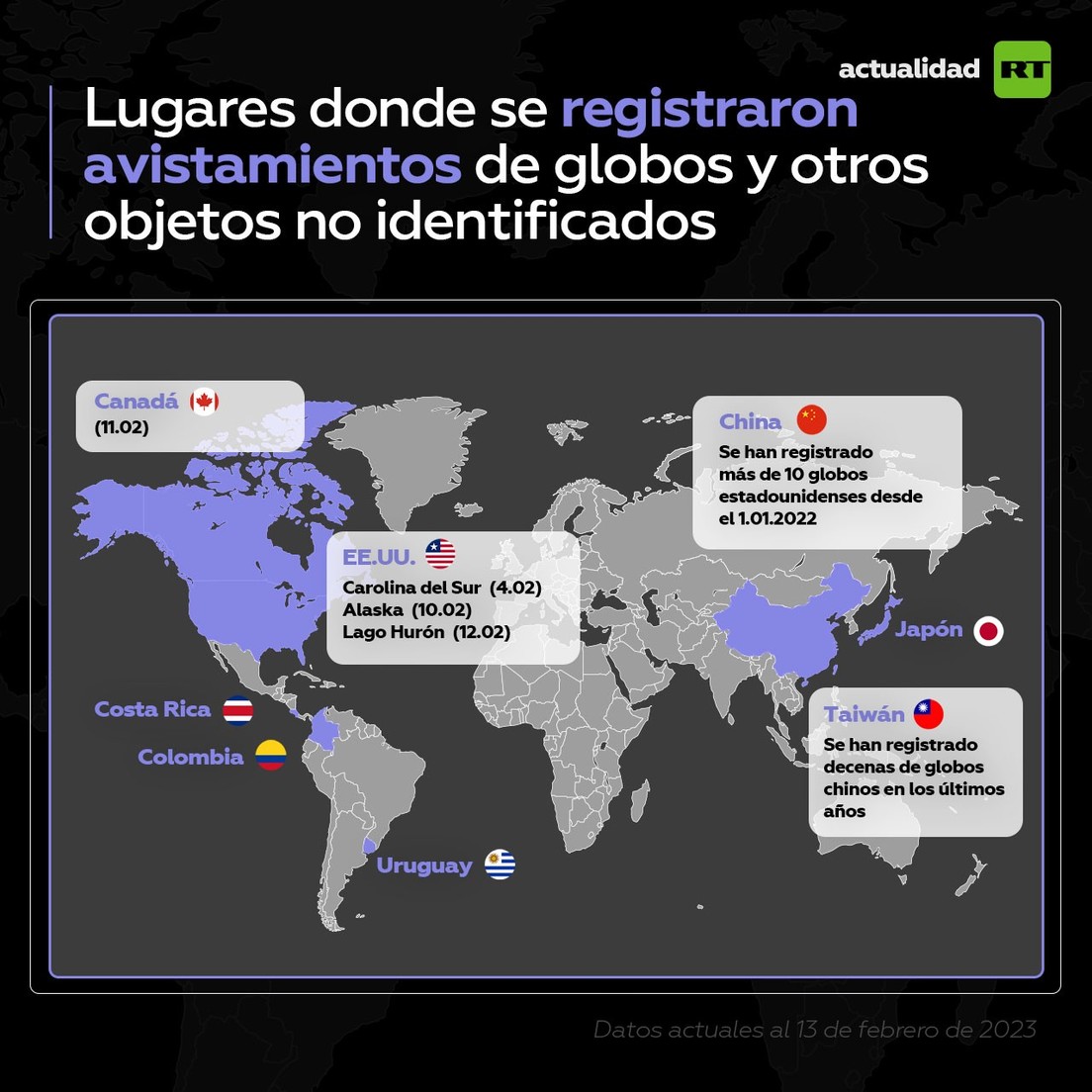 John Kirby, coordinador para Comunicaciones Estratégicas del Consejo de Seguridad Nacional de EE.UU., detalló que el objeto derribado en Alaska tenía el tamaño de un pequeño auto y estaba volando a una altitud de 40.000 pies [unos 12.200 metros]. En lo que se refiere al objeto derribado sobre Canadá, la ministra de Defensa canadiense, Anita Anand, señaló que se trataba de "un pequeño objeto cilíndrico" que estaba volando a una altitud de unos 12 kilómetros.