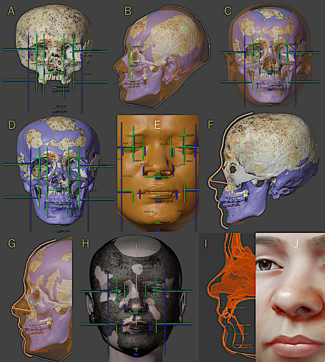 Para dar vida al rostro de la mujer, Moraes reconstruyó digitalmente las partes del cráneo que faltaban (los incisivos menores y la mandíbula) y usó proyecciones estadísticas para perfilar las estructuras faciales. Además, utilizó una técnica de deformación anatómica para darle volumen a la cara.