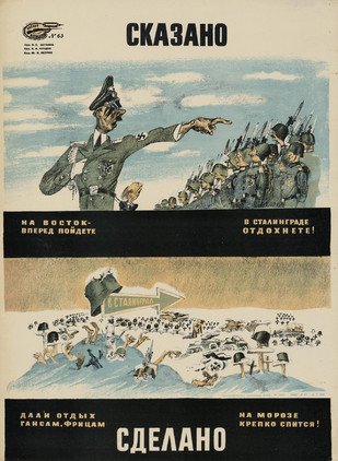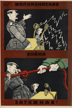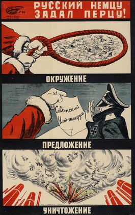 Algunos carteles diseñados por una alianza de artistas soviéticos son un buen ejemplo de cómo la población, incluso de los territorios asediados por la Alemania nazi y sus países satélites, hacía frente al empuje ideológico del enemigo. Este colectivo de pintores y caricaturistas, denominado 'Boyevói Karandash' ('lápiz de combate'), realizaba su trabajo creativo en la ciudad de Leningrado desde el inicio de la Gran Guerra Patria y en pleno sitio de las tropas alemanas y finlandesas.